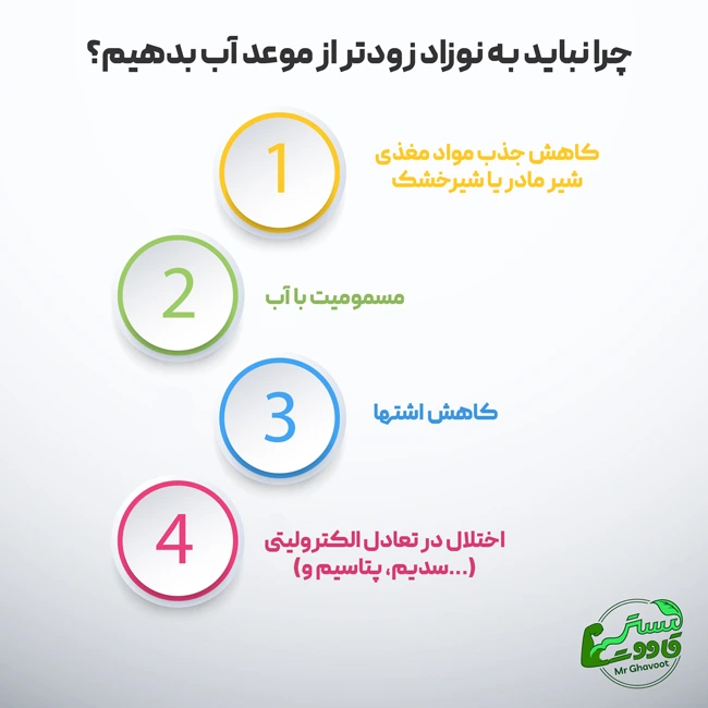 در ماههای اول، سیستم گوارشی و کلیههای نوزاد هنوز به طور کامل رشد نکردهاند. اب دادن به نوزاد میتواند تعادل سدیم در بدن او را بر هم بزند و منجر به مسمومیت با آب (Water Intoxication) شود، که در موارد شدید حتی ممکن است باعث تشنج یا کما شود.