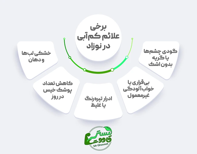 یادتان باشد که در یک سال اول زندگی نوزاد، آب فقط بهعنوان یک مکمل غذایی کاربرد دارد و نباید جانشین غذای اصلی شود. برخی علائم کمآبی در نوزاد عبارتاند از: