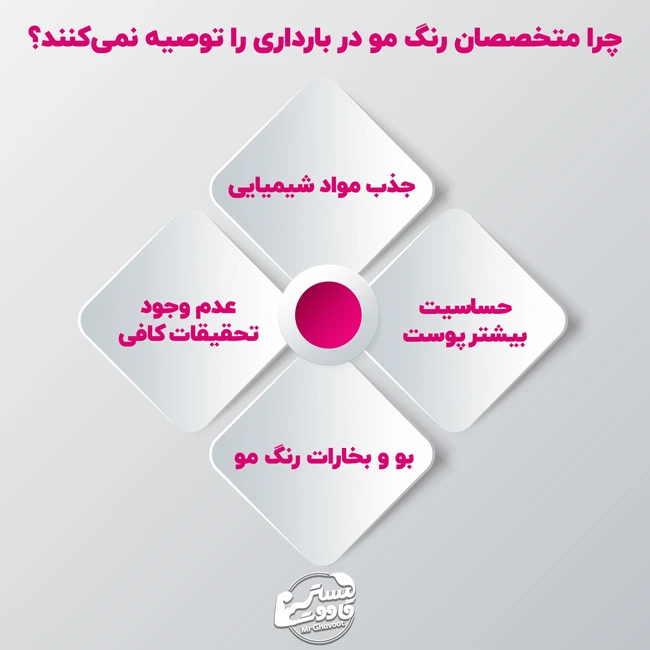 دوران بارداری بسیار دوران حساس و پر از تغیرات هورمونی هست و رنگ مو هم به دلیل مواد شیمیایی و آمونیاکی که داره احتمال داره باعث بروز بیماری های پوستی برای مادر بشه و در نهایت به جنین هم آسیب بزنه