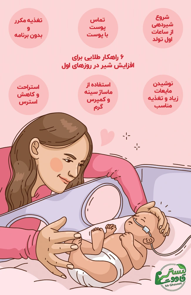 - اگر تا روز پنجم پس از زایمان هیچ نشانهای از ترشح شیر ندارید یا نوزاد وزن کم کرده، حتما با متخصص مشورت کنید.